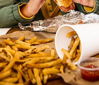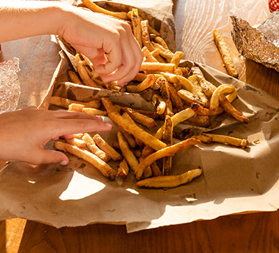 When we say our food is handmade, we mean it. Our beef is locally sourced and our fries are cut right in the store. We handform our burger patties, tear our lettuce by hand, hand-pick our mushrooms, hand-chop our onions, and slice our green peppers perfectly thin.